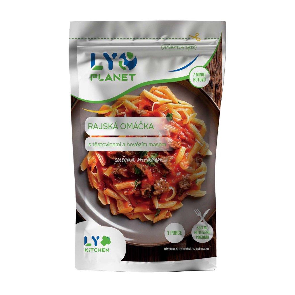 Lyo Rajská omáčka s těstovinami a hovězím masem - tradiční jídlo s jemně sladkou rajskou omáčkou, šťavnatými kousky hovězího masa a těstovinami.