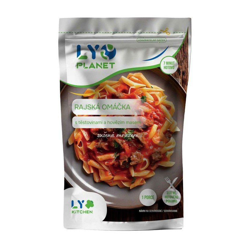 Rajská omáčka s hovězím a těstovinami – chutné lyofilizované jídlo plné tradičních chutí, které jednoduše připravíte zalitím horkou vodou.